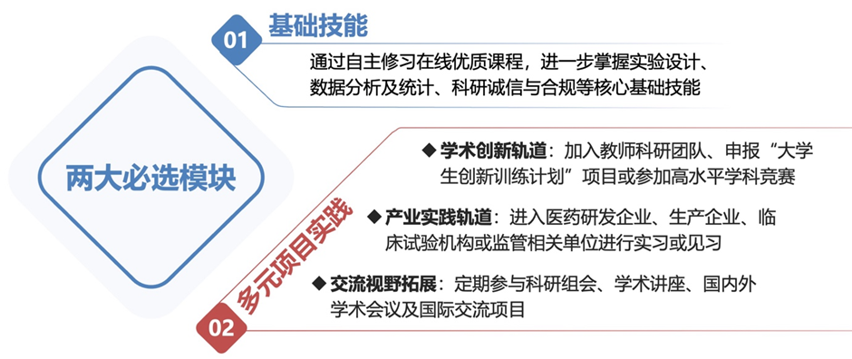 通过这门3.5学分、贯穿5学期的实践课程,学生能自主获取,并整合运用科研基础技能(如文献、设计、分析)或产业核心知识(如法规、流程、标准),解决所选实践领域中遇到的具体问题;理解不同实践路径(学术研究、产业创新、社会服务)的内在逻辑与专业要求,构建起药学领域从基础研究到产品与服务落地的系统化知识视角。